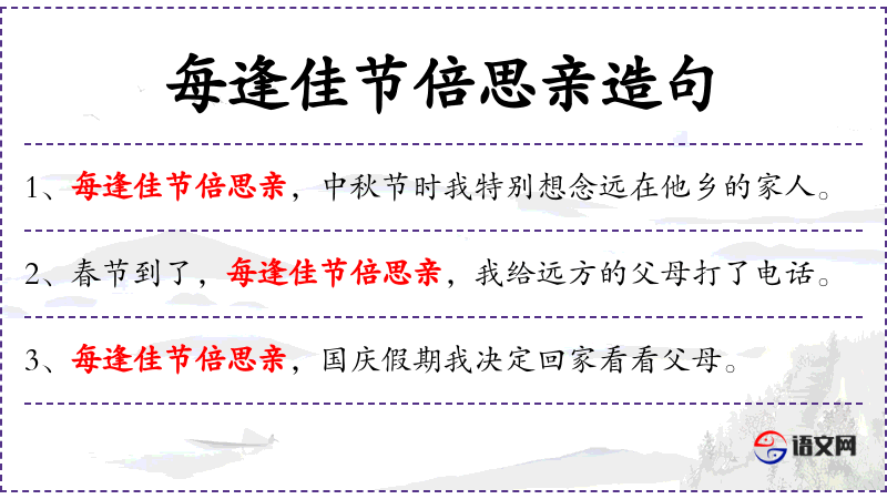 1. 【每逢佳节倍思亲】 - 佳节:原指农历九月九日重阳节。指到了节日特别想念在外地亲人的心情。