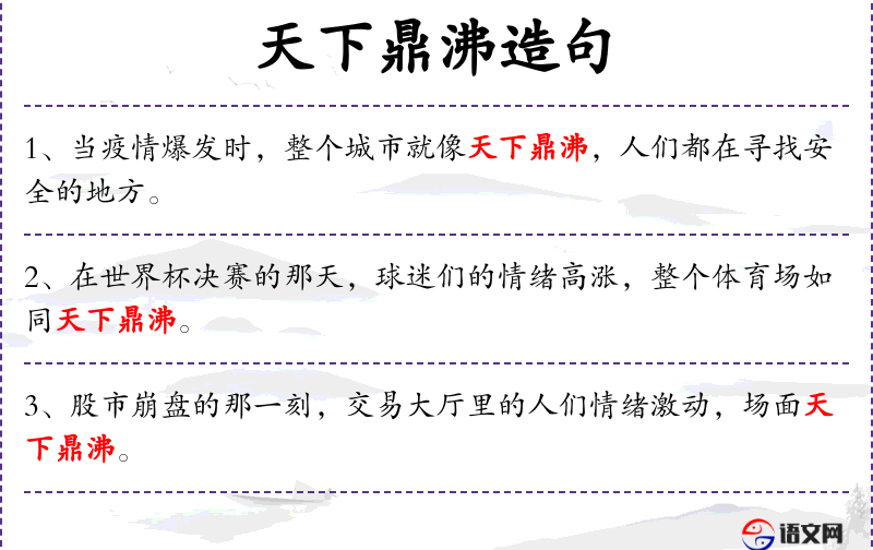“天下鼎沸”是一个汉语成语,源自古代,形容场面非常热闹。在现代汉语中,这个成语常用于形容大型活动或**的热闹场面。