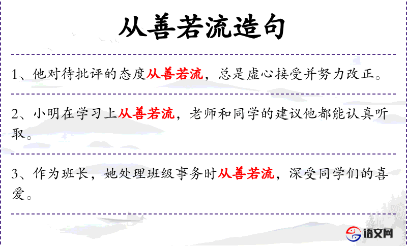 - 从善若流:成语,意为像水一样顺从善道,比喻顺应好的意见