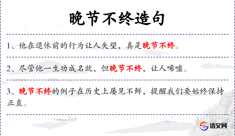 2. 【晚节不终】 - 晚节:指晚年的节操。指到了晚年却不能保持节操。