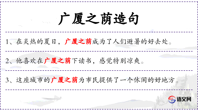句子:“他喜欢在广厦之荫下读书,感觉特别凉爽。”