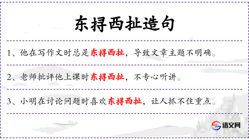 成语:东揚西扯,源自传统文化,形容说话或写文章不围绕主题。 文化意义**:强调沟通时应紧扣主题,提高效率。