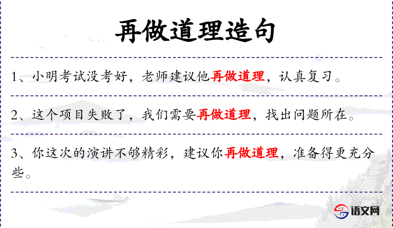 - 再做道理:动词短语,意为再次理解或掌握道理。