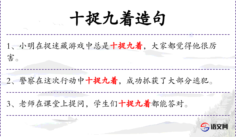 - 状语:“在猜谜游戏中十捉九着”,描述动作发生的情境。