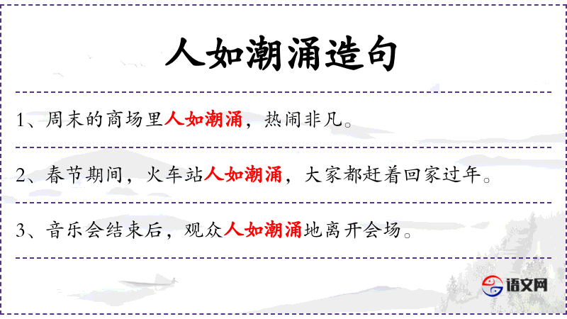 - 人如潮涌:形容人群像潮水一样涌动,比喻人群移动的壮观场面。