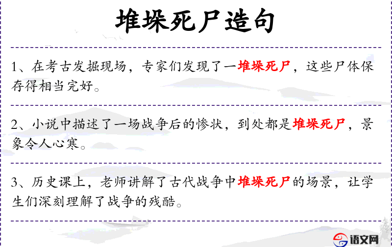 - 堆垛死尸:宾语的一部分,描述战争中的残酷场景。 *. 场景:宾语的一部分,指具体的情况或画面。
