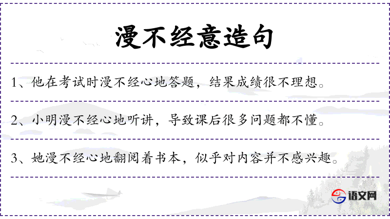 2. 【漫不经心】 - 漫:随便;经心:在意。随随便便,不放在心上。