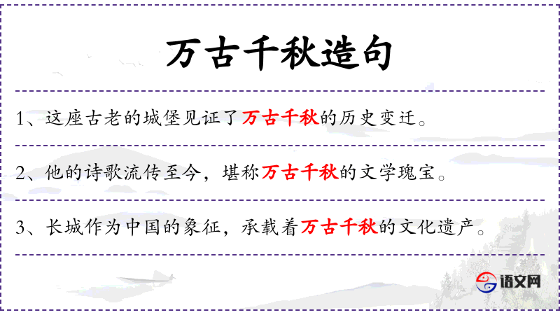 - 万古千秋:形容时间极其久远,同义词如“永恒”、“长久”。