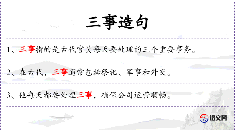 1. 【三事】 三件事。所指随文而异。指正德﹑利用﹑厚生; 三件事。所指随文而异。指倡德﹑和乱﹑终齐; 三种官职; 指三公; 三件。
