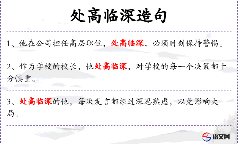 - 相关成语:“处高临深”源自《左传·僖公二十五年》,原意是指站在高处俯视深渊,比喻地位高、责任重。