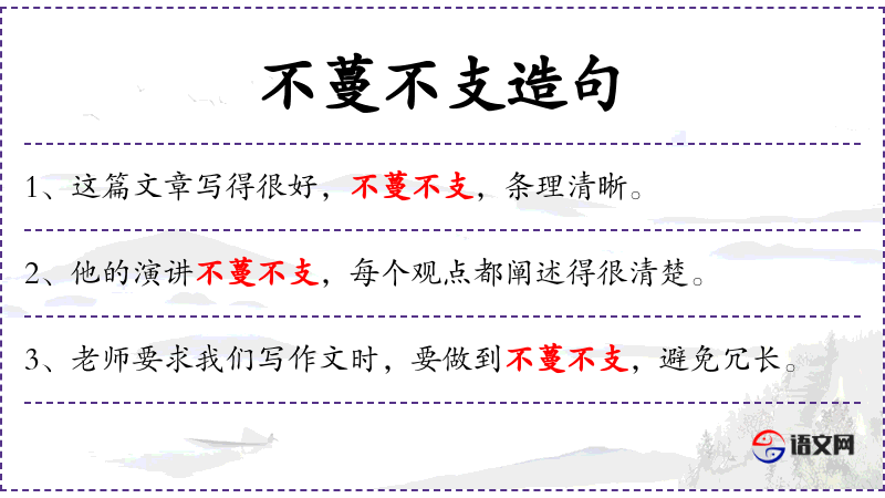 1. 【不蔓不支】 蔓:藤蔓,引伸为蔓延。既不蔓延,也不分支。比喻说话或写文章简明扼要,不拖泥带水。