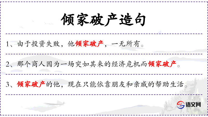 - 倾家破产:形容一个人失去所有财产,无法维持正常生活。
