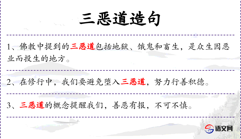 1. 【三恶道】 - 佛教谓六道轮回中作恶业者受生的三个去处。即造上品十恶业者堕入的地狱道;造中品十恶业者堕入的饿鬼道;造下品十恶业者堕入的畜生道。