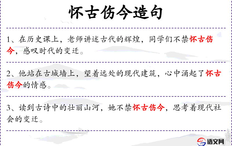 - 怀古伤今:成语,意思是怀念古代的事物,感慨现今的变迁。