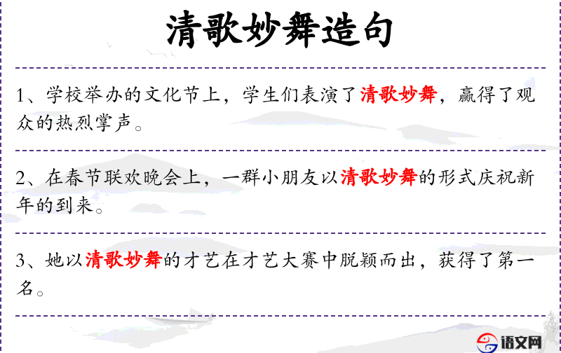 1. 【清歌妙舞】 - 指清亮的歌声,美妙的舞蹈。