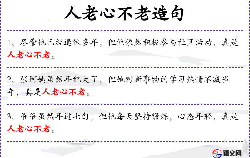 “人老心不老”是**文化中常见的表达,强调年龄不是限制,心态才是关键。这种观念鼓励人们无论年龄多大,都要保持积极向上的心态。