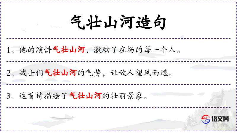 2. 【气壮山河】 - 气:气概;壮:使壮丽;山河:高山和大河。形容气概豪迈,使祖国山河因而更加壮丽。