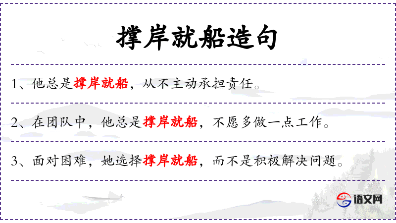 - 撑岸就船:这个成语字面意思是“撑住岸边以便船只靠岸”,在这里比喻某人在项目中只做最基本的工作,不愿意承担更多的工作或责任。