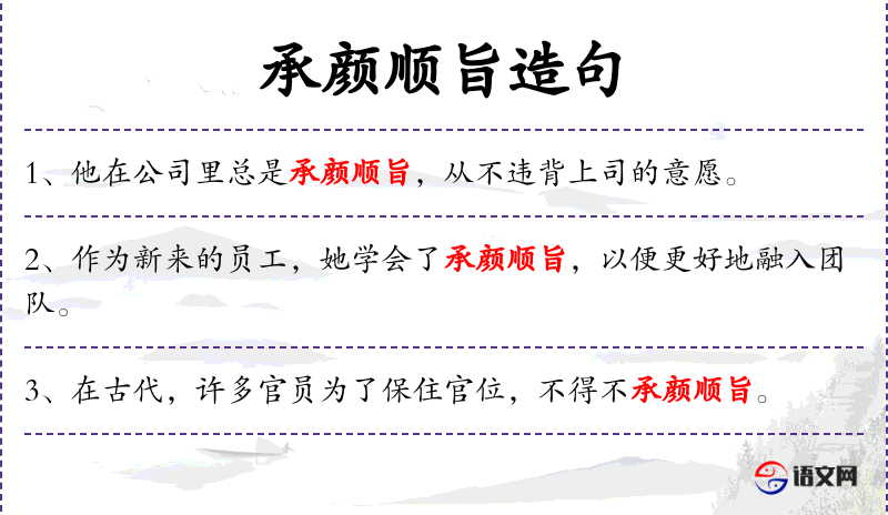 - 承颜顺旨:指顺应他人的意愿或态度,通常用于描述在社交或工作场合中的一种策略。