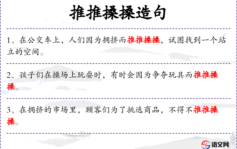 - 谓语:推推搡搡,期待着