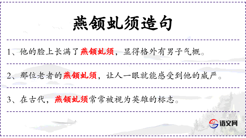4. 【燕颔虬须】 - 形容相貌威武。借指武将、勇士。同“燕颔虎头”。