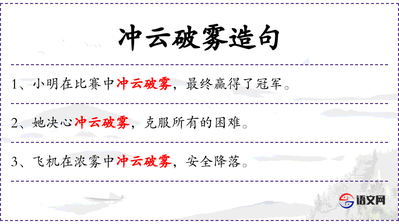 - 冲云破雾:比喻克服困难,突破障碍,常用来形容事物或人的突出表现。