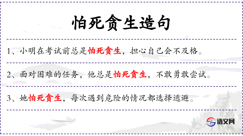- 谓语:总是怕死贪生,不敢勇敢尝试