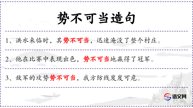 - 第一个分句的谓语是“势不可当”。