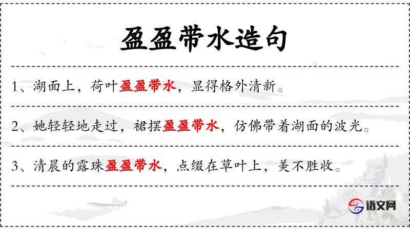 1. 【盈盈带水】 - 盈盈:水清而浅的样子。像一条一带那样不很宽阔但很清澈的水。形容一水之隔,相距不远。