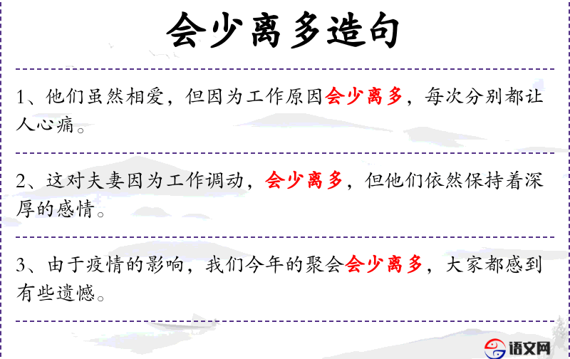 2. 【会少离多】 相会少,别离多。感慨人生聚散无常或别离之苦。