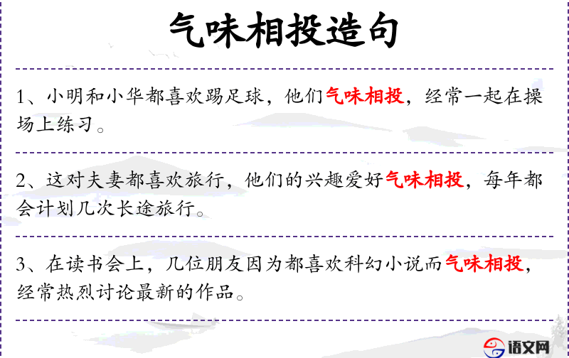 6. 【气味相投】 气味:比喻性格和志趣;投:投合。指人思想作风相同,彼此很合得来。