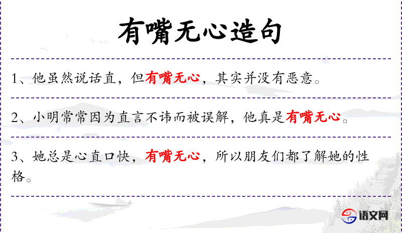 1. 【有嘴无心】 - 犹言有口无心。指不是有心说的。