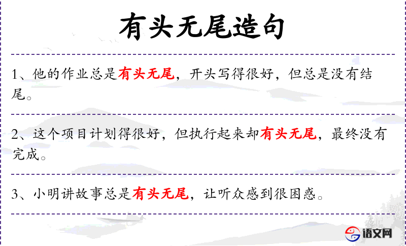 3. 【有头无尾】 有开头没有收尾。指没有把事情做完。