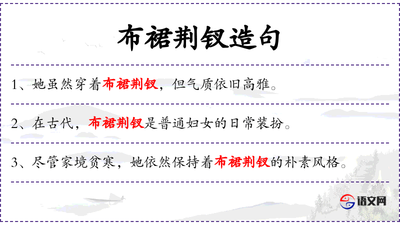 “布裙荆钗”这个词汇反映了古代**女性的服饰特点,通常与朴素、节俭的生活态度相关联。这个句子可能蕴含了对这种生活态度的赞美。