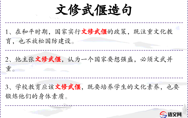 - 宾语:文修武偃、一个国家要想强盛,必须文武并重
