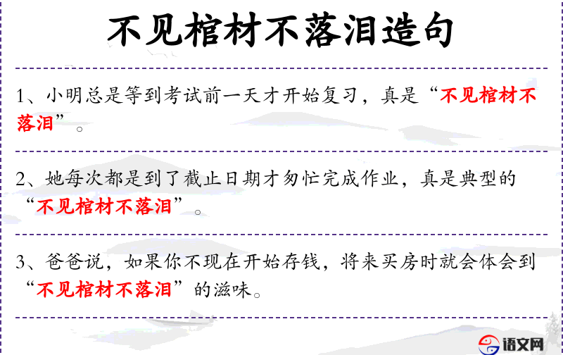 这句话通常出现在教育环境中,老师在提醒学生不要拖延复,直到考试临近才开始紧张学。这种行为被比喻为“不见棺材不落泪”,意味着学生只有在面临失败或严重后果时才会采取行动。这个成语的使用强调了及时行动的重要性,以及拖延可能带来的负面后果。