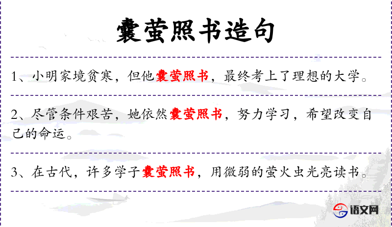3. 【囊萤照书】 囊萤:把萤火虫放在袋子中。形容家境贫寒,勤苦读书。