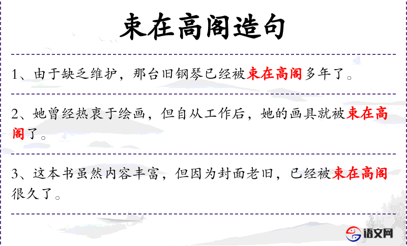 1. 【束在高阁】 - 捆起来以后放在高高的架子上。比喻放着不用。同“束之高阁”。