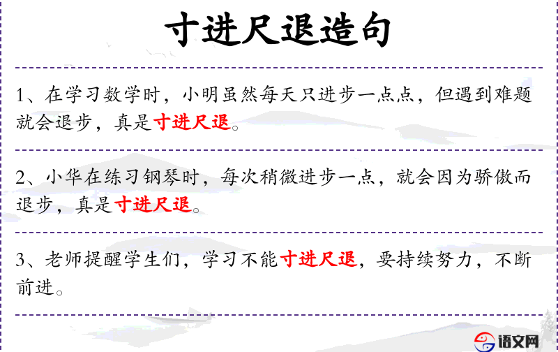 - 寸进尺退:这个成语源自**古代度量衡,比喻进步小而退步大,强调持续努力的重要性。