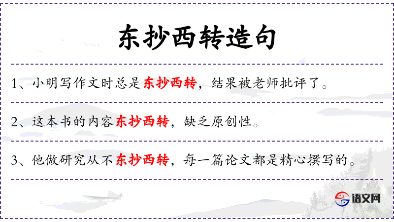 - 东抄西转:意为从东边抄一点,从西边转一点,形容文章或作品缺乏原创性,内容拼凑。