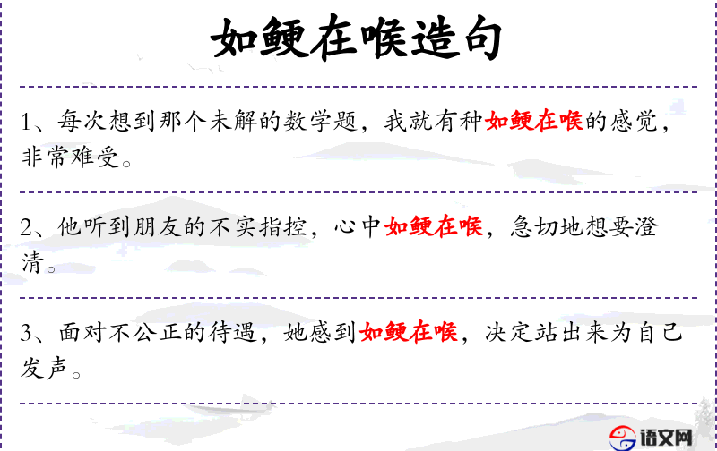 “如鲠在喉”是一个中文成语,源自古代文学,常用于形容心里有话或事情说不出来,感到难受。这个成语反映了中文表达中对情感细腻描绘的特点。