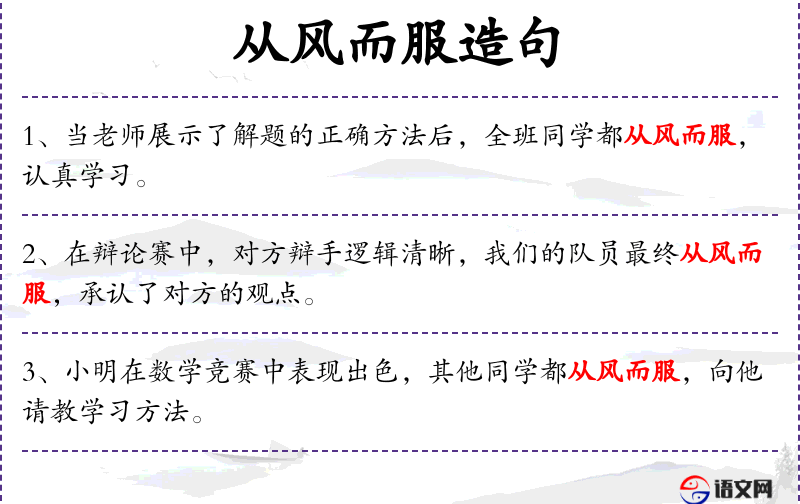 句子中“从风而服”是一个比喻,源自**古代的“风行草偃”,意指像风吹过草地一样迅速接受。这反映了中文中常用的比喻表达方式。