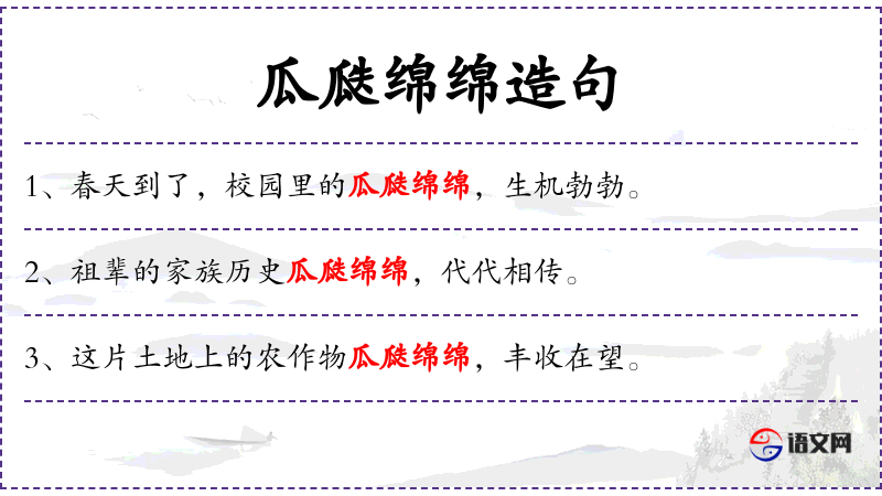 1. 【瓜瓞绵绵】 - 瓞:小瓜;绵绵:延续不断的样子。如同一根连绵不断的藤上结了许多大大小小的瓜一样。引用为祝颂子孙昌盛。