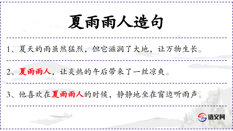 - 夏雨雨人:成语,形容夏天的雨给人带来凉爽和舒适。