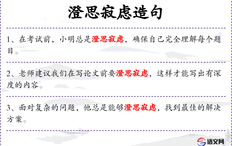 4. 【澄思寂虑】 专心思索,冷静考虑。