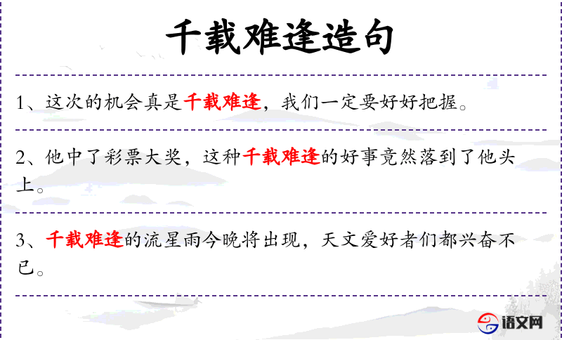 1. 【千载难逢】 一千年里也难碰到一次。形容机会极其难得。
