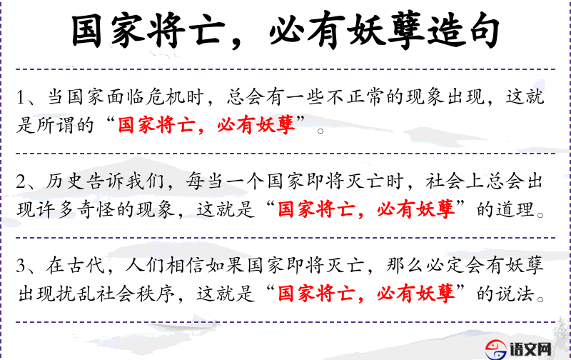 - “在文学作品中,作者有时会借助‘国家将亡,必有妖孽’这一成语来描绘国家危机时期的混乱与不稳定。”