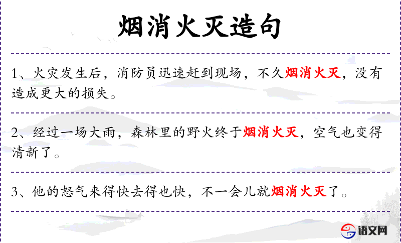 2. 【烟消火灭】 - 烟云消散,火光熄灭。比喻事物消灭干净。