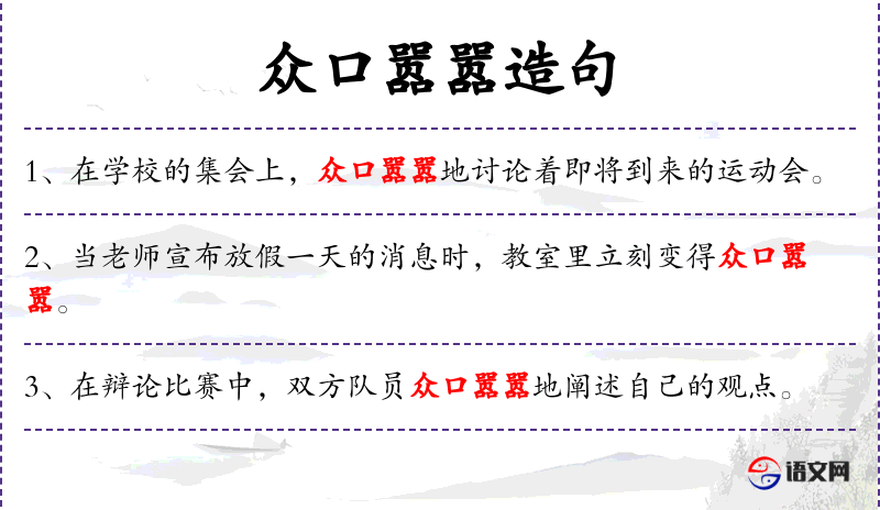 句子:“当学校宣布新的校规时,学生们众口嚣嚣地表达自己的看法。”