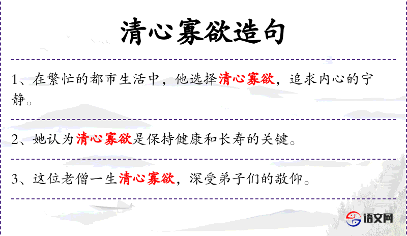 清:清净;寡:少:欲:欲望,需求。保持心地清净,减少欲念。